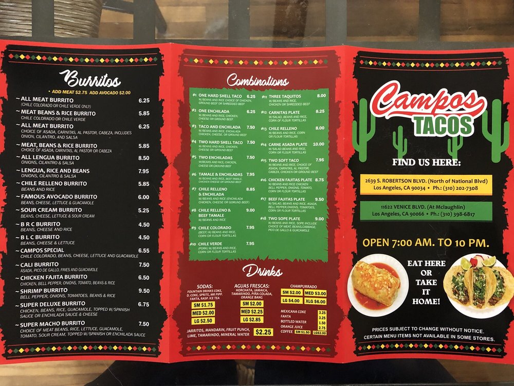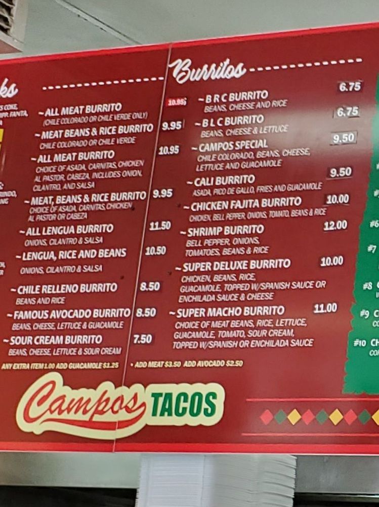 Campos Tacos in Los Angeles offers a variety of Mexican dishes, including breakfast options like Chorizo and Eggs Breakfast Plate and Huevos Rancheros. Customers praise the friendly service and delicious food, with favorites like Asada tacos and chicken enchiladas. The affordable prices and generous portions make this spot a must-visit for those looking for authentic Mexican cuisine. The clean and cozy environment, along with vegetarian options and fresh ingredients, add to the overall positive dining experience. With positive reviews highlighting the flavorful beans, salsa, and tacos, Campos Tacos stands out for its consistent quality and quick service. Whether you're craving a breakfast burrito or a satisfying meal like a taco and enchilada combo, Campos Tacos delivers on taste and value.